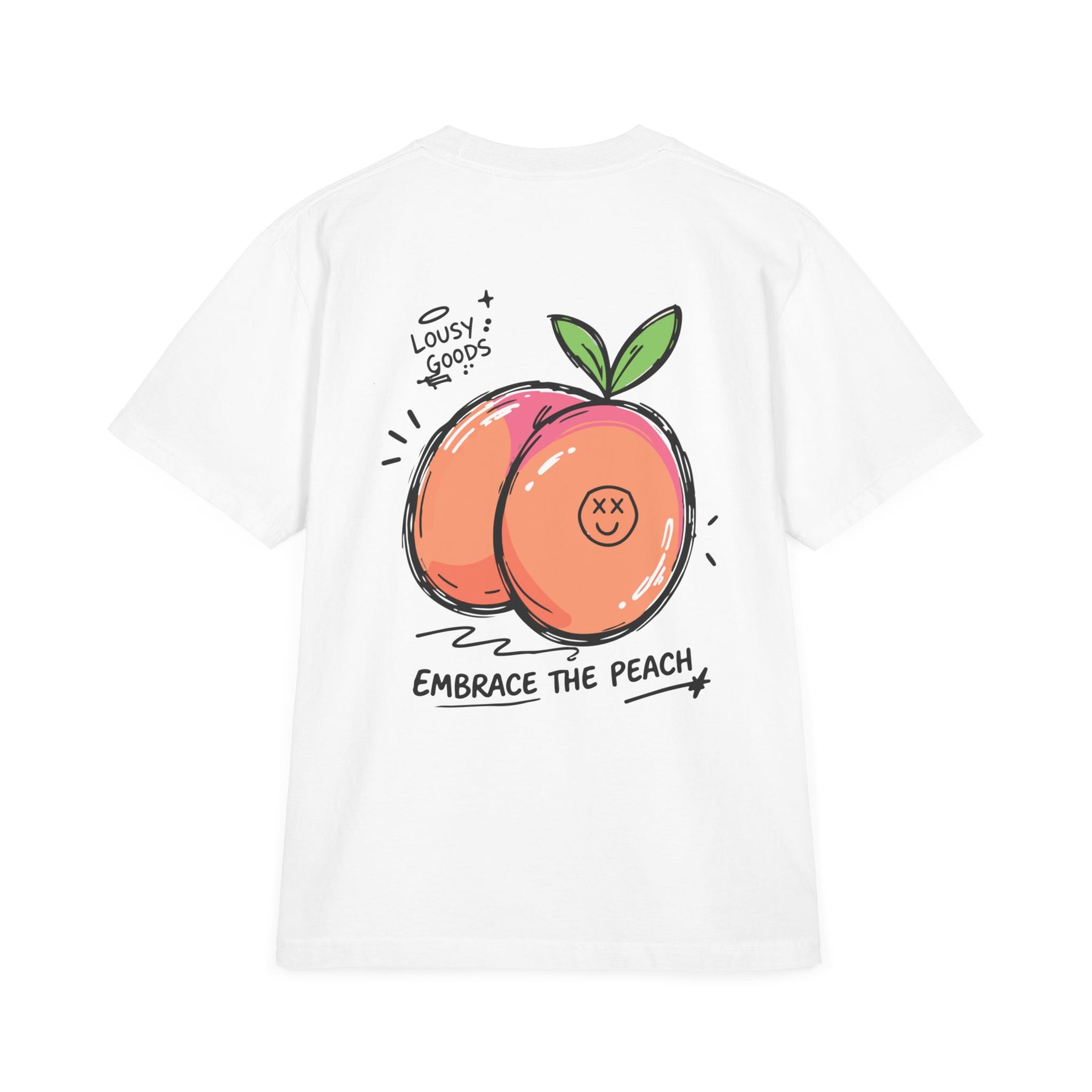 Up front, bold, rounded lettering reads “BIG THICC ENERGY”—loud, unapologetic, and impossible to ignore. On the back, a hand-drawn peach graphic stamped with the XX smiley and the phrase “Embrace the Peach” brings the humor full circle.