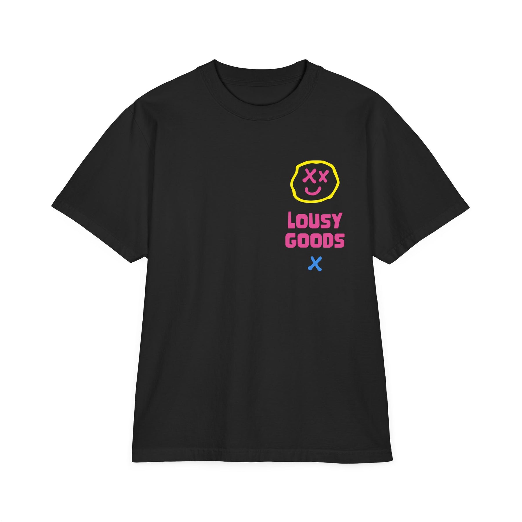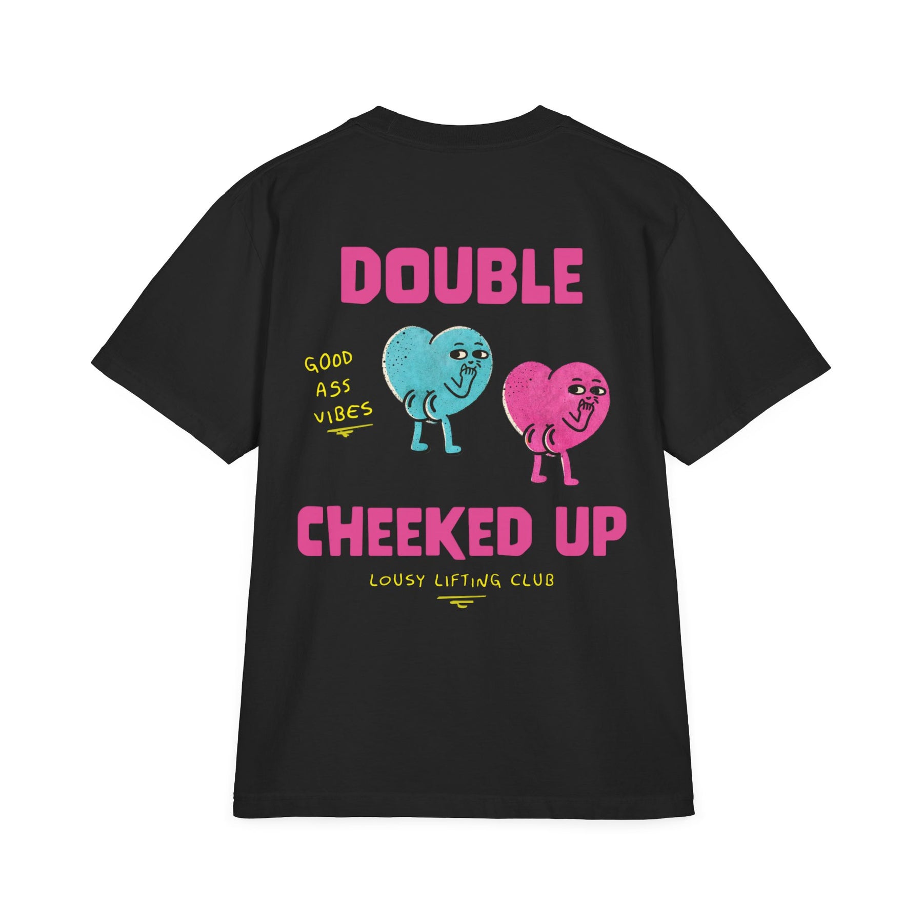This garment-dyed drop-shoulder tee carries a playful, hand-drawn energy. Soft, vintage-washed cotton feels worn-in from the first wear while bold, neon-like graphics add a cheeky pop: a small smiley and logo at the front, and a tongue-in-cheek “DOUBLE CHEEKED UP” print with quirky heart-and-butt characters on the back. It sits relaxed across the shoulders with a forward-thrust seam and ribbed crew neck, letting the art do the talking whether you’re layering it under a jacket or wearing it solo at a weekend hangout. The assembled-in-USA construction and tear-away label make it easy to wear all day without fuss.